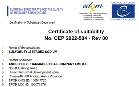安徽伟德国际1946官网药用辅料磺丁基倍他环糊精钠喜获CEP证书